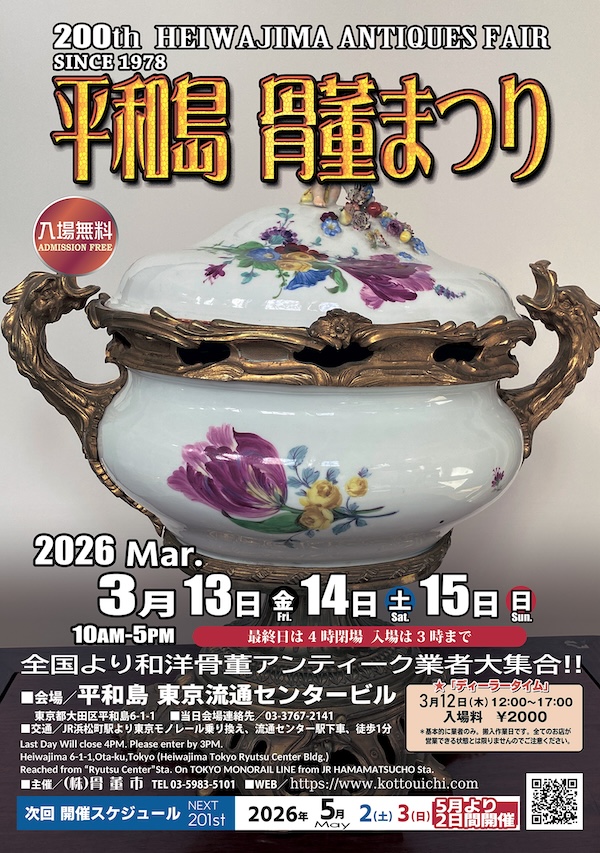 日本で最も歴史のある屋内骨董市。日本全国から多数の和洋骨董アンティーク業者が出店する。いくつかの業者が根付や提物を扱う。