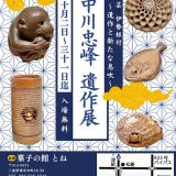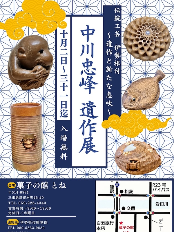 伊勢で長年にわたり現代根付作家として活躍され、今年ご逝去された元国際根付彫刻会会長・中川忠峰氏の遺作展。お弟子さんの作品も出品される。